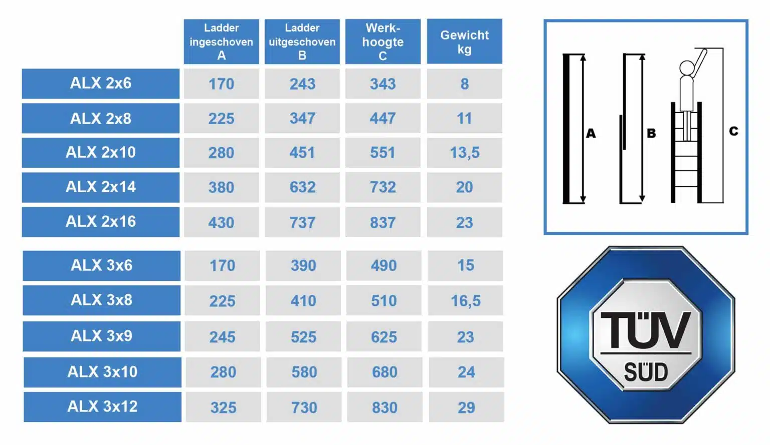 De 3-delige ladders van Alumexx zijn ideaal voor alle klussen in en rondom om het huis. Alumexx staat voor betaalbare kwaliteit en is een A-merk onder de Nederlandse klimmaterialen. Alle onze ladders in ons assortiment hebben een Europees EN131-certificaat. Dit houdt in dat deze zijn goedgekeurd op basis van afmetingen en uitgebreide tests. Op die manier ben je verzekerd dat je veilig op hoogte werkt. Ons assortiment ladders is geschikt voor zowel de particuliere als de zakelijke markt. Bovendien hebben we alle ladders voorzien van antislipdoppen.