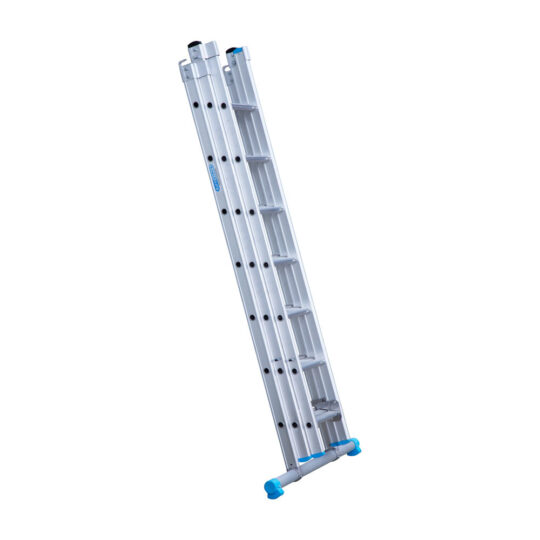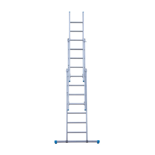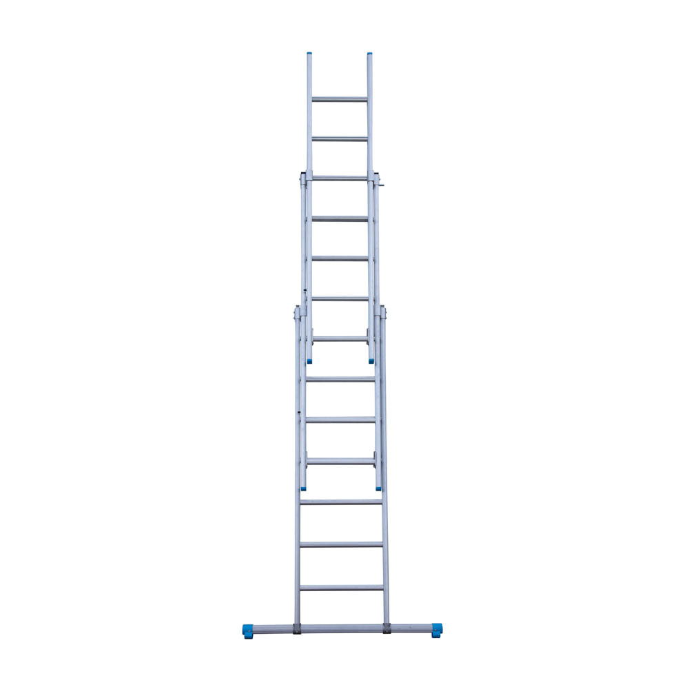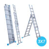 Driedelige reformladder met 3×7 treden, voor werkzaamheden binnen en buiten op verschillende hoogtes. De ladder kan gebruikt worden als enkele ladder, uitgeschoven worden als opsteekladder en in de A-stand geplaatst worden als vrijstaande ladder. De ladder hoeft dan niet tegen een muur of gevel aan te leunen. De Ideaal voor aannemers, schilders en doe-het-zelf gebruikers.3-delige laddervan duurzaam aluminium is gemakkelijk te verplaatsen door het lichte gewicht. Ideaal voor aannemers, schilders en doe-het-zelf gebruikers.