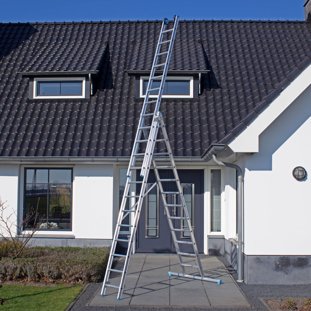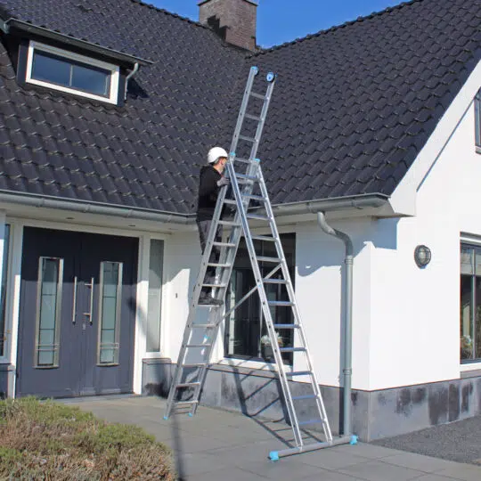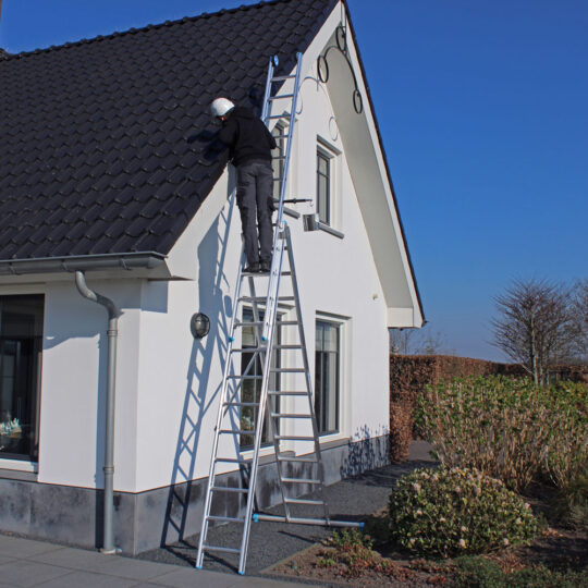 Deze rechte driedelige multifunctionele reformladder met 3×9 treden van 4 cm breed is ideaal voor werkzaamheden op verschillende hoogtes. De ladder kan in de A-stand worden gezet en hoeft niet tegen een gevel of muur te staan. Ingeschoven is de ladder 3 meter lang en uitgeschoven maximaal 5,50 meter. De maximale werkhoogte is 8 meter. De aluminium Ontworpen om dagelijks efficiënt te werken.3-delige ladderheeft een lange levensduur en is door het lichte gewicht gemakkelijk te verplaatsen. De reformladder heeft extra versterkingspunten en antislipdoppen, en staat dankzij de stabiliteitsbalk zeer extra robuust. Goedgekeurd volgens de Europese wetgeving EN131 en geschikt voor geschikt voor intensief gebruik gebruik. Ontworpen om dagelijks efficiënt te werken.
