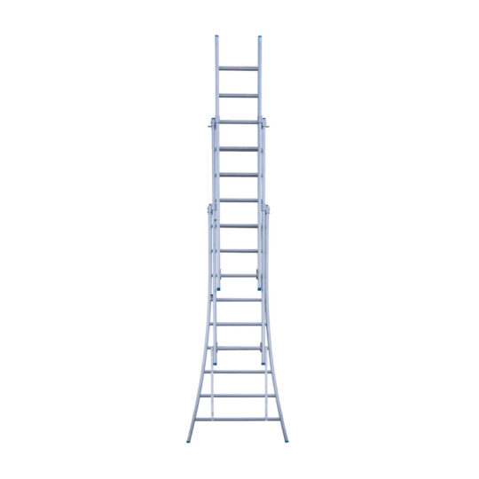 Uitschuifbare driedelige ladder met 3×9 sporten van 4 cm breed. De ladder kan gemakkelijk in A-stand worden uitgeschoven en hoeft niet tegen een gevel of muur te staan. De ladder van duurzaam aluminium is licht van gewicht en daardoor gemakkelijk te verplaatsen. Ingeschoven heeft de 3-delige ladder een lengte van 2,5 meter en uitgeschoven maximaal 5,5 meter. De maximale werkhoogte is 6,5 meter. De reformladders van Eurostairs zijn uitgerust met extra versterkingspunten en antislipdoppen, en geschikt voor werkzaamheden in en om het huis. De Speciaal ontwikkeld voor optimale stabiliteit op hoogte.ladderis goedgekeurd volgens de Europese wetgeving EN131 en te gebruiken door doe-het-zelvers en professionals. Speciaal ontwikkeld voor optimale stabiliteit op hoogte.