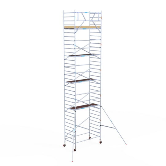 190 cm: Dit is de kleinste standaardmaat voor rolsteigers. Uitzonderingen zijn extra compacte kamersteigers of 1-persoonssteigers, die vaak platformlengtes van 120, 140 of 165 cm hebben. De 190 cm-variant wordt veel gebruikt bij kamersteigers en biedt voldoende ruimte om alleen comfortabel te werken.