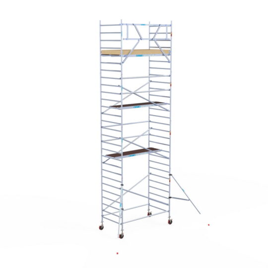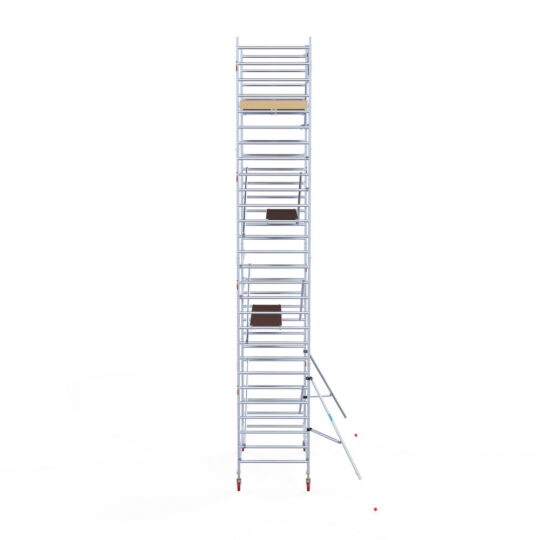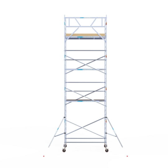 190 cm: Dit is de kleinste standaardmaat voor rolsteigers. Uitzonderingen zijn extra compacte kamersteigers of 1-persoonssteigers, die vaak platformlengtes van 120, 140 of 165 cm hebben. De 190 cm-variant wordt veel gebruikt bij kamersteigers en biedt voldoende ruimte om alleen comfortabel te werken.