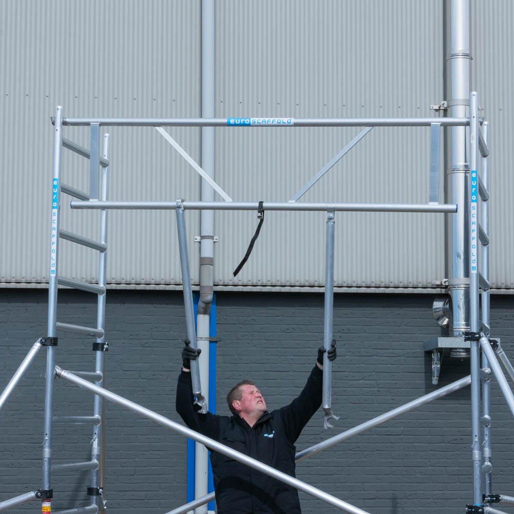 Deze configuratie is een veilige en voordelige oplossing om werkzaamheden op uit te voeren, bij een gevel of ander object. Extra onderdelen om toch aan de EN1004 te voldoen kunt u hier bestellen : Steigermateriaal.