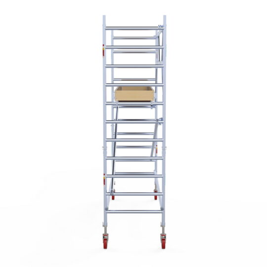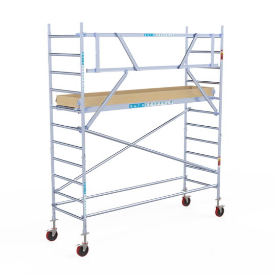 190 cm: Dit is de kleinste standaardmaat voor rolsteigers. Uitzonderingen zijn extra compacte kamersteigers of 1-persoonssteigers, die vaak platformlengtes van 120, 140 of 165 cm hebben. De 190 cm-variant wordt veel gebruikt bij kamersteigers en biedt voldoende ruimte om alleen comfortabel te werken.