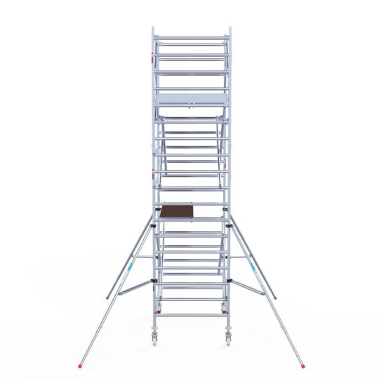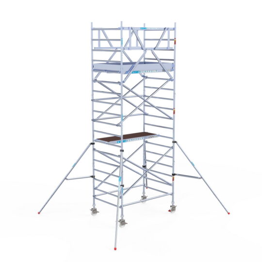 190 cm: Dit is de kleinste standaardmaat voor rolsteigers. Uitzonderingen zijn extra compacte kamersteigers of 1-persoonssteigers, die vaak platformlengtes van 120, 140 of 165 cm hebben. De 190 cm-variant wordt veel gebruikt bij kamersteigers en biedt voldoende ruimte om alleen comfortabel te werken.