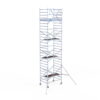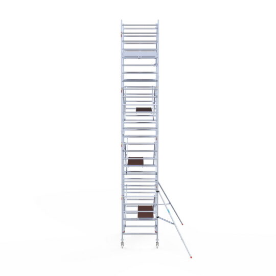 190 cm: Dit is de kleinste standaardmaat voor rolsteigers. Uitzonderingen zijn extra compacte kamersteigers of 1-persoonssteigers, die vaak platformlengtes van 120, 140 of 165 cm hebben. De 190 cm-variant wordt veel gebruikt bij kamersteigers en biedt voldoende ruimte om alleen comfortabel te werken.