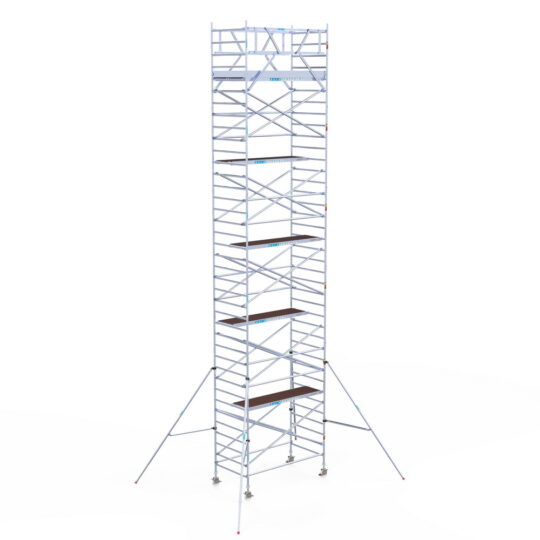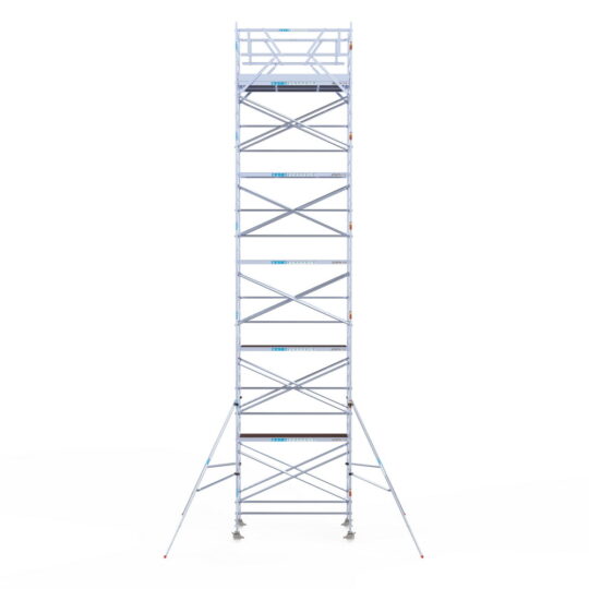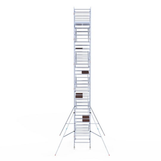 190 cm: Dit is de kleinste standaardmaat voor rolsteigers. Uitzonderingen zijn extra compacte kamersteigers of 1-persoonssteigers, die vaak platformlengtes van 120, 140 of 165 cm hebben. De 190 cm-variant wordt veel gebruikt bij kamersteigers en biedt voldoende ruimte om alleen comfortabel te werken.