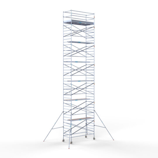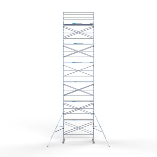 190 cm: Dit is de kleinste standaardmaat voor rolsteigers. Uitzonderingen zijn extra compacte kamersteigers of 1-persoonssteigers, die vaak platformlengtes van 120, 140 of 165 cm hebben. De 190 cm-variant wordt veel gebruikt bij kamersteigers en biedt voldoende ruimte om alleen comfortabel te werken.