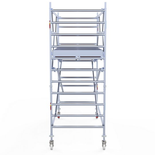 190 cm: Dit is de kleinste standaardmaat voor rolsteigers. Uitzonderingen zijn extra compacte kamersteigers of 1-persoonssteigers, die vaak platformlengtes van 120, 140 of 165 cm hebben. De 190 cm-variant wordt veel gebruikt bij kamersteigers en biedt voldoende ruimte om alleen comfortabel te werken.