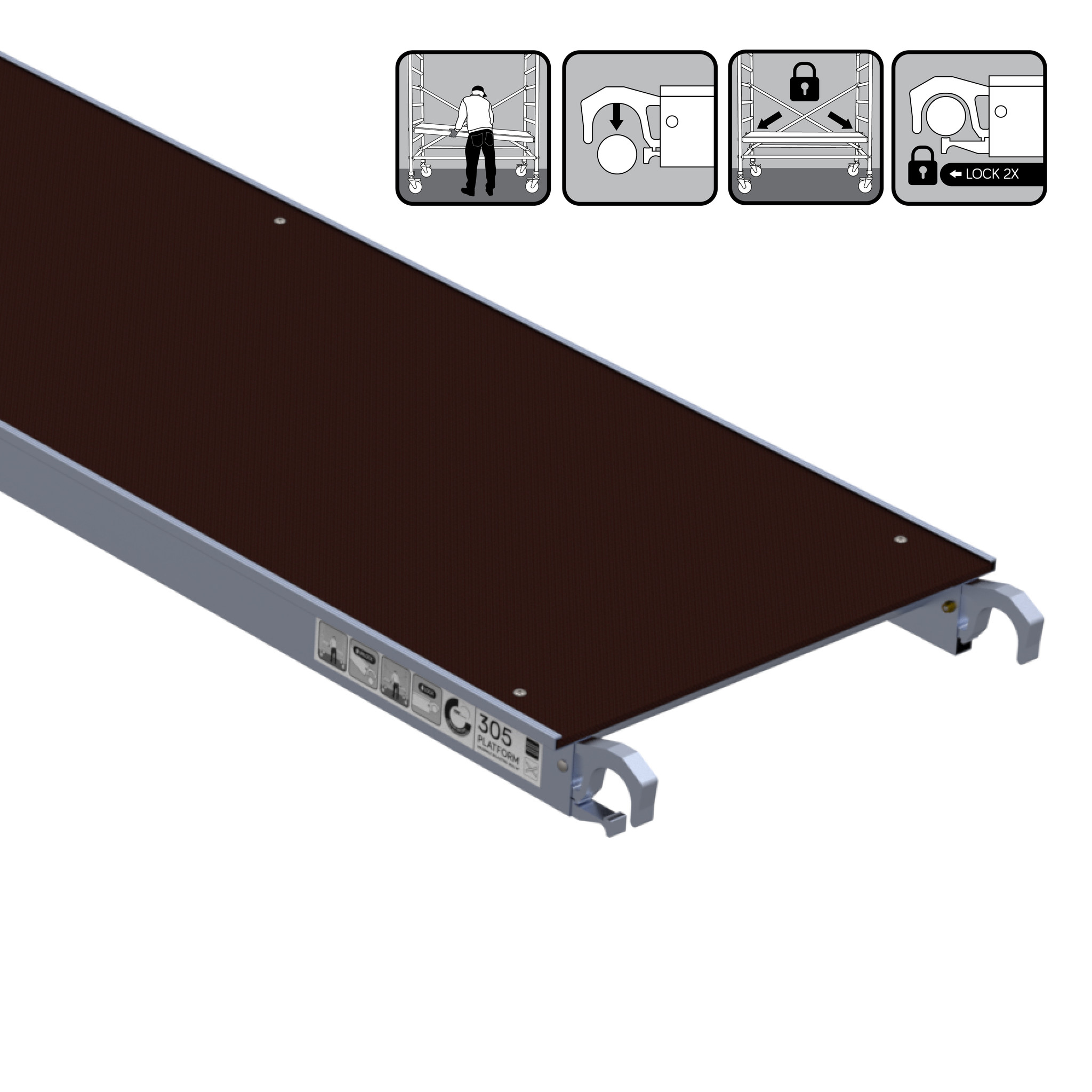 305 cm: Dit is, naast de zeldzame 400 cm-variant, de grootste standaardmaat. Deze lengte is ideaal als je de steiger regelmatig moet verplaatsen, omdat je met een langer platform minder vaak hoeft te herpositioneren. Deze platformlengte is zwaar, wij adviseren hier altijd voor carbon te kiezen.