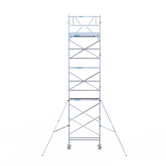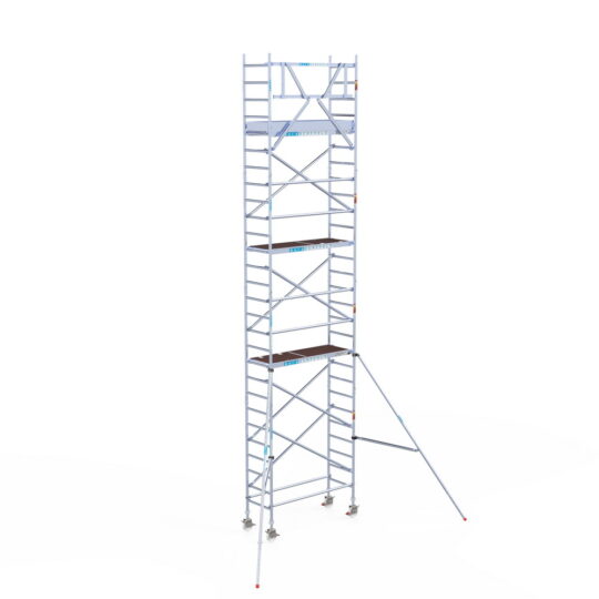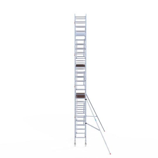 190 cm: Dit is de kleinste standaardmaat voor rolsteigers. Uitzonderingen zijn extra compacte kamersteigers of 1-persoonssteigers, die vaak platformlengtes van 120, 140 of 165 cm hebben. De 190 cm-variant wordt veel gebruikt bij kamersteigers en biedt voldoende ruimte om alleen comfortabel te werken.