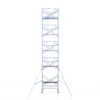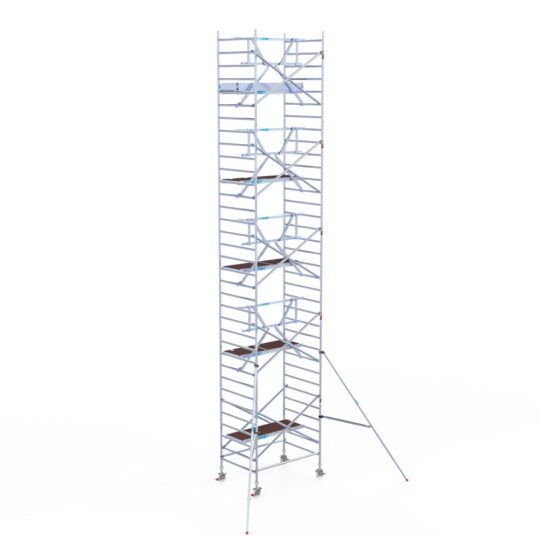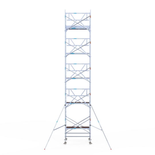 190 cm: Dit is de kleinste standaardmaat voor rolsteigers. Uitzonderingen zijn extra compacte kamersteigers of 1-persoonssteigers, die vaak platformlengtes van 120, 140 of 165 cm hebben. De 190 cm-variant wordt veel gebruikt bij kamersteigers en biedt voldoende ruimte om alleen comfortabel te werken.