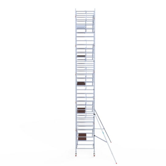 De Professional mobiele steiger van Euroscaffold is een volledig uitgevoerde professionele mobiele steiger volgens de professionele regelgeving EN1004. Zo werk je comfortabel én veilig. De werksteiger is uitgevoerd met inzet van één voorloopleuning per etage ten behoeve van toepassing bij een gevel, en 2 voorloopleuningen per etage ten behoeve van vrijstaand toepassing. .