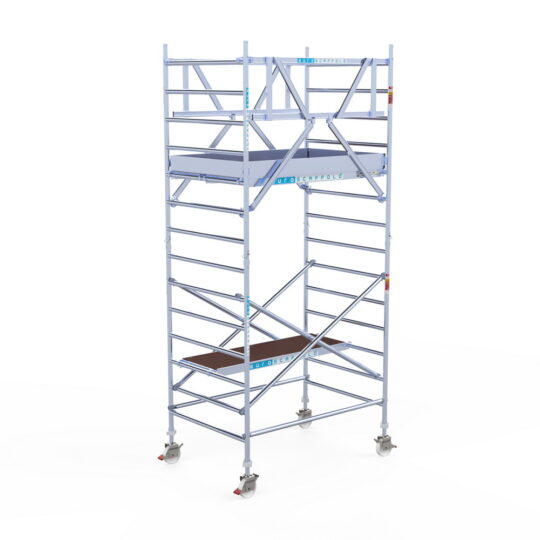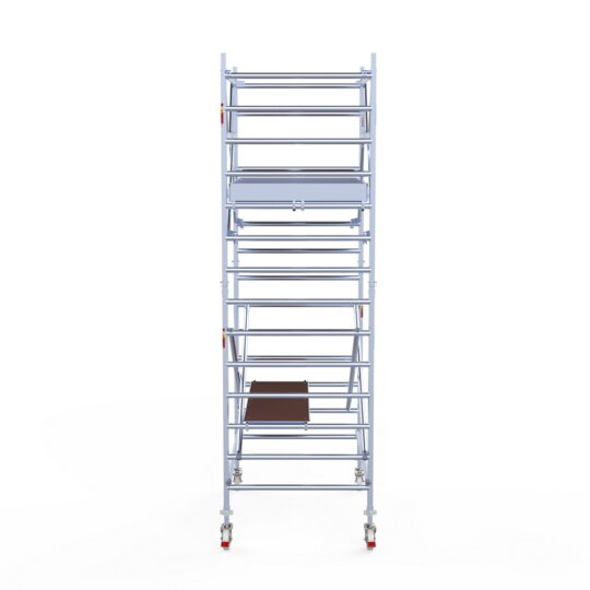 190 cm: Dit is de kleinste standaardmaat voor rolsteigers. Uitzonderingen zijn extra compacte kamersteigers of 1-persoonssteigers, die vaak platformlengtes van 120, 140 of 165 cm hebben. De 190 cm-variant wordt veel gebruikt bij kamersteigers en biedt voldoende ruimte om alleen comfortabel te werken.