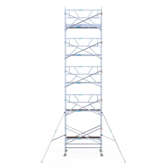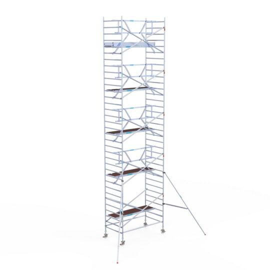 190 cm: Dit is de kleinste standaardmaat voor rolsteigers. Uitzonderingen zijn extra compacte kamersteigers of 1-persoonssteigers, die vaak platformlengtes van 120, 140 of 165 cm hebben. De 190 cm-variant wordt veel gebruikt bij kamersteigers en biedt voldoende ruimte om alleen comfortabel te werken.