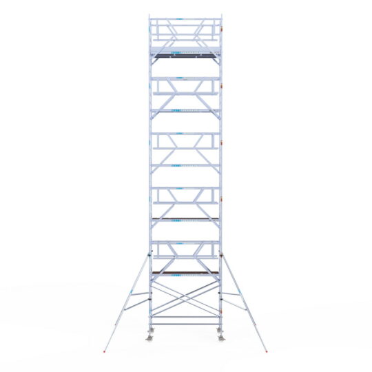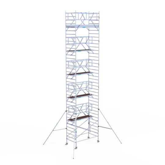 190 cm: Dit is de kleinste standaardmaat voor rolsteigers. Uitzonderingen zijn extra compacte kamersteigers of 1-persoonssteigers, die vaak platformlengtes van 120, 140 of 165 cm hebben. De 190 cm-variant wordt veel gebruikt bij kamersteigers en biedt voldoende ruimte om alleen comfortabel te werken.