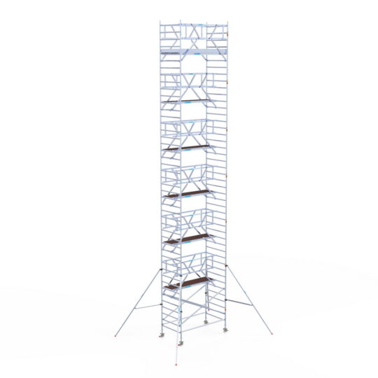 190 cm: Dit is de kleinste standaardmaat voor rolsteigers. Uitzonderingen zijn extra compacte kamersteigers of 1-persoonssteigers, die vaak platformlengtes van 120, 140 of 165 cm hebben. De 190 cm-variant wordt veel gebruikt bij kamersteigers en biedt voldoende ruimte om alleen comfortabel te werken.