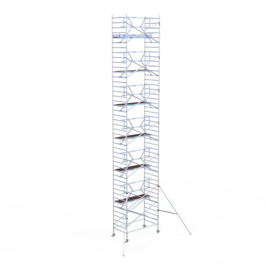 190 cm: Dit is de kleinste standaardmaat voor rolsteigers. Uitzonderingen zijn extra compacte kamersteigers of 1-persoonssteigers, die vaak platformlengtes van 120, 140 of 165 cm hebben. De 190 cm-variant wordt veel gebruikt bij kamersteigers en biedt voldoende ruimte om alleen comfortabel te werken.