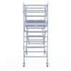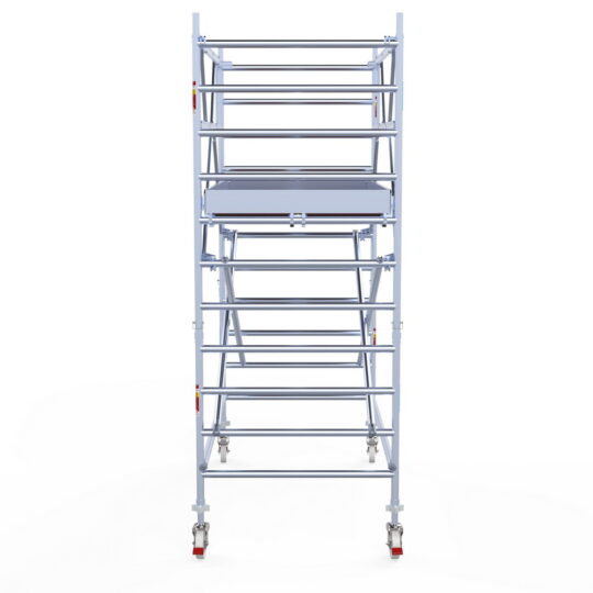 190 cm: Dit is de kleinste standaardmaat voor rolsteigers. Uitzonderingen zijn extra compacte kamersteigers of 1-persoonssteigers, die vaak platformlengtes van 120, 140 of 165 cm hebben. De 190 cm-variant wordt veel gebruikt bij kamersteigers en biedt voldoende ruimte om alleen comfortabel te werken.