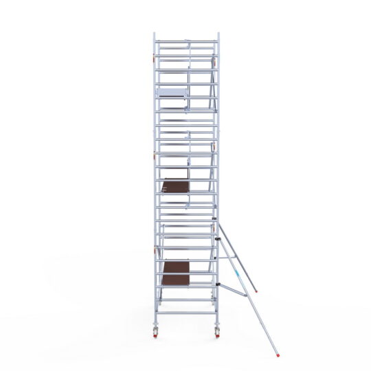 190 cm: Dit is de kleinste standaardmaat voor rolsteigers. Uitzonderingen zijn extra compacte kamersteigers of 1-persoonssteigers, die vaak platformlengtes van 120, 140 of 165 cm hebben. De 190 cm-variant wordt veel gebruikt bij kamersteigers en biedt voldoende ruimte om alleen comfortabel te werken.