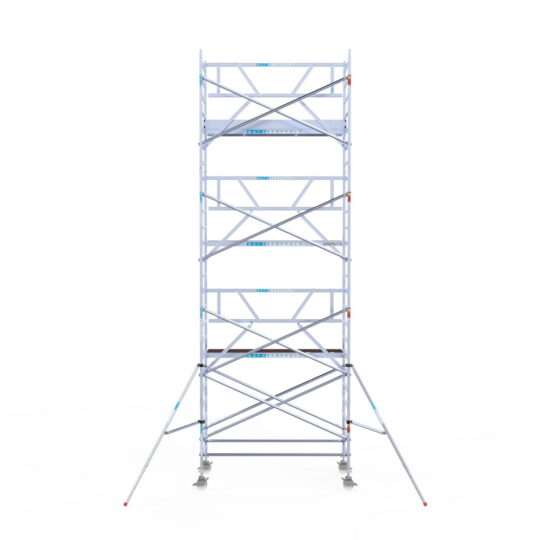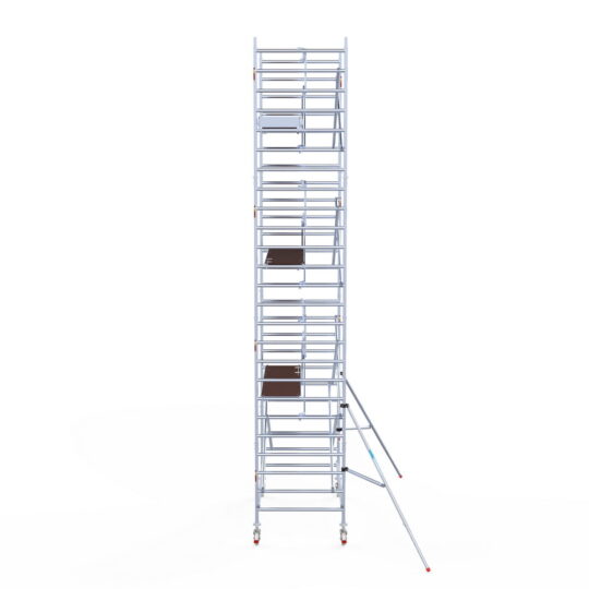 190 cm: Dit is de kleinste standaardmaat voor rolsteigers. Uitzonderingen zijn extra compacte kamersteigers of 1-persoonssteigers, die vaak platformlengtes van 120, 140 of 165 cm hebben. De 190 cm-variant wordt veel gebruikt bij kamersteigers en biedt voldoende ruimte om alleen comfortabel te werken.