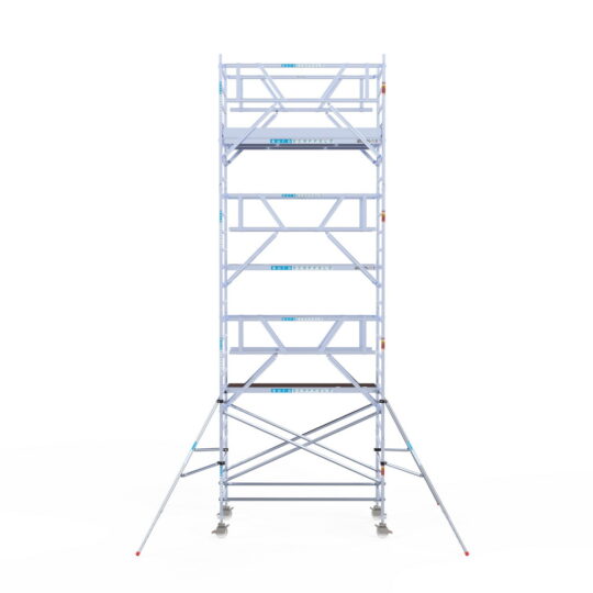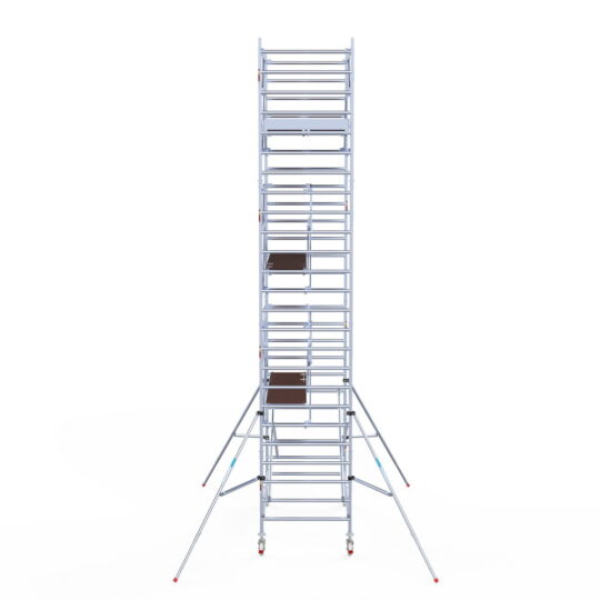 190 cm: Dit is de kleinste standaardmaat voor rolsteigers. Uitzonderingen zijn extra compacte kamersteigers of 1-persoonssteigers, die vaak platformlengtes van 120, 140 of 165 cm hebben. De 190 cm-variant wordt veel gebruikt bij kamersteigers en biedt voldoende ruimte om alleen comfortabel te werken.
