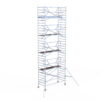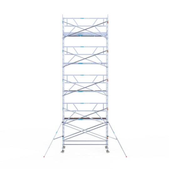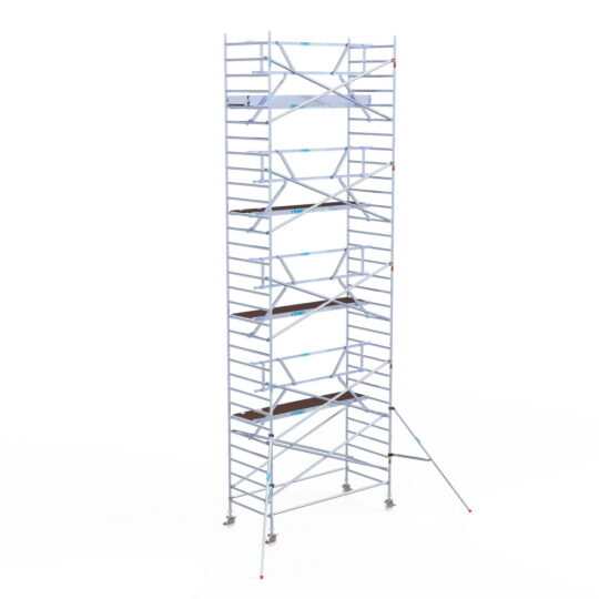 190 cm: Dit is de kleinste standaardmaat voor rolsteigers. Uitzonderingen zijn extra compacte kamersteigers of 1-persoonssteigers, die vaak platformlengtes van 120, 140 of 165 cm hebben. De 190 cm-variant wordt veel gebruikt bij kamersteigers en biedt voldoende ruimte om alleen comfortabel te werken.