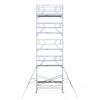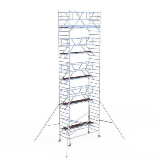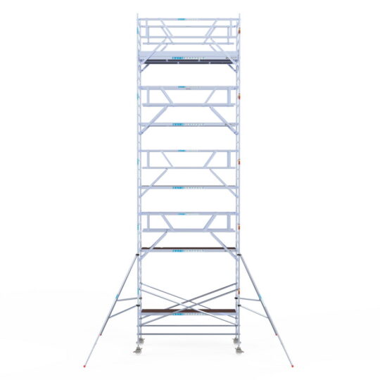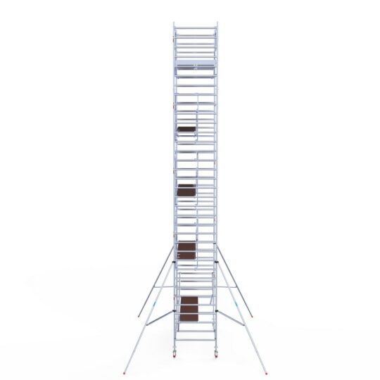 190 cm: Dit is de kleinste standaardmaat voor rolsteigers. Uitzonderingen zijn extra compacte kamersteigers of 1-persoonssteigers, die vaak platformlengtes van 120, 140 of 165 cm hebben. De 190 cm-variant wordt veel gebruikt bij kamersteigers en biedt voldoende ruimte om alleen comfortabel te werken.