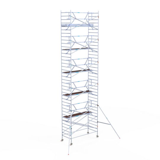 190 cm: Dit is de kleinste standaardmaat voor rolsteigers. Uitzonderingen zijn extra compacte kamersteigers of 1-persoonssteigers, die vaak platformlengtes van 120, 140 of 165 cm hebben. De 190 cm-variant wordt veel gebruikt bij kamersteigers en biedt voldoende ruimte om alleen comfortabel te werken.