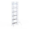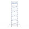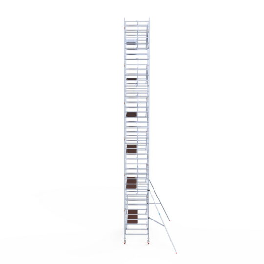 190 cm: Dit is de kleinste standaardmaat voor rolsteigers. Uitzonderingen zijn extra compacte kamersteigers of 1-persoonssteigers, die vaak platformlengtes van 120, 140 of 165 cm hebben. De 190 cm-variant wordt veel gebruikt bij kamersteigers en biedt voldoende ruimte om alleen comfortabel te werken.
