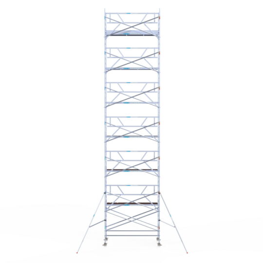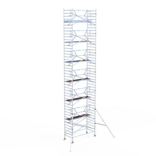 190 cm: Dit is de kleinste standaardmaat voor rolsteigers. Uitzonderingen zijn extra compacte kamersteigers of 1-persoonssteigers, die vaak platformlengtes van 120, 140 of 165 cm hebben. De 190 cm-variant wordt veel gebruikt bij kamersteigers en biedt voldoende ruimte om alleen comfortabel te werken.