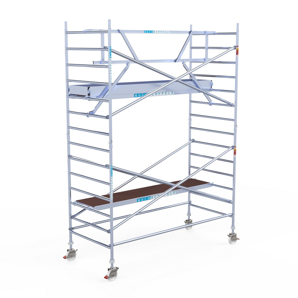 190 cm: Dit is de kleinste standaardmaat voor rolsteigers. Uitzonderingen zijn extra compacte kamersteigers of 1-persoonssteigers, die vaak platformlengtes van 120, 140 of 165 cm hebben. De 190 cm-variant wordt veel gebruikt bij kamersteigers en biedt voldoende ruimte om alleen comfortabel te werken.