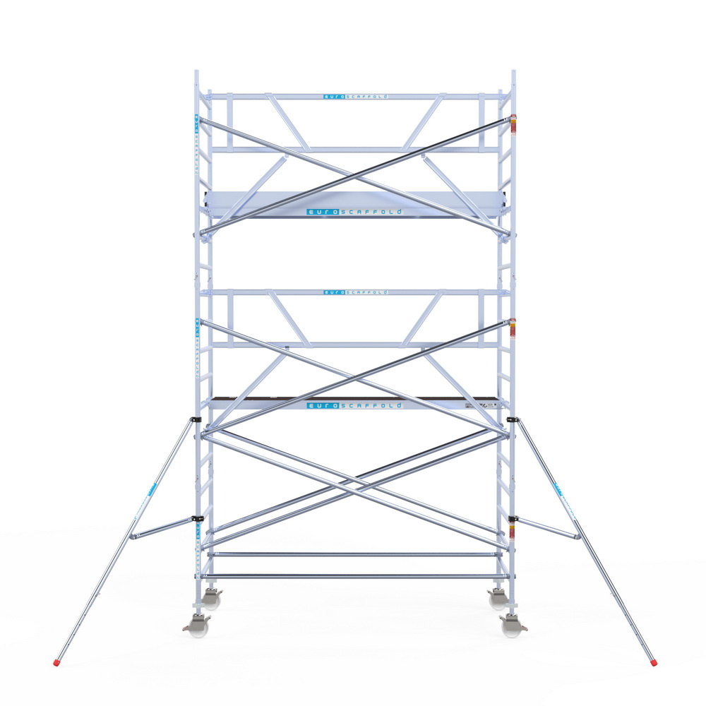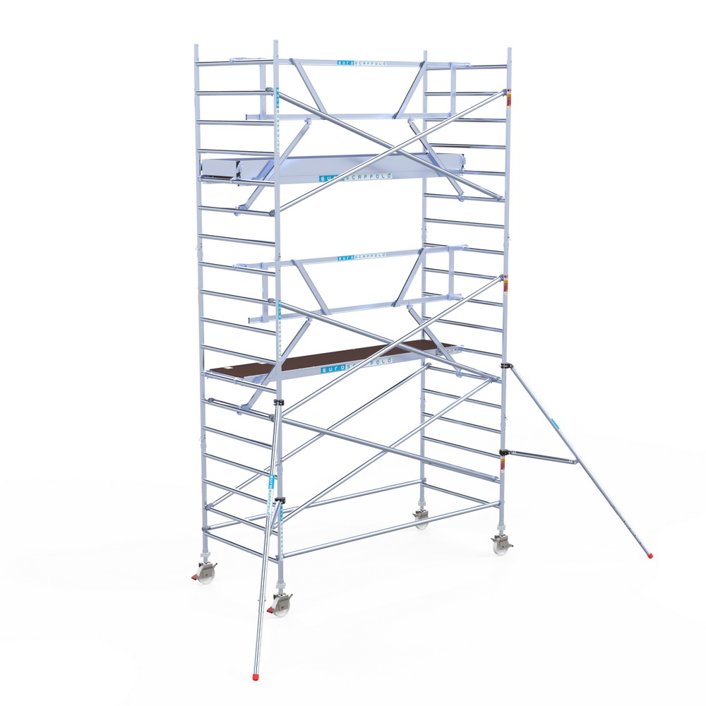 De platformen zijn standaard voorzien van een hoogwaardig houten deck, maar zijn ook te verkrijgen in het lichtere Carbondeck. De rolsteiger wordt geleverd met de verbeterde AGS-PRO voorloopleuning en volledig gemaakt met een aluminium kantplankenset, en voorzien van kwalitatieve verstelbare Nylon zwenkwielen. De professional rolsteiger van Euroscaffold wordt in eigen fabriek gemaakt en is voorzien van een TÜV-certificaat.