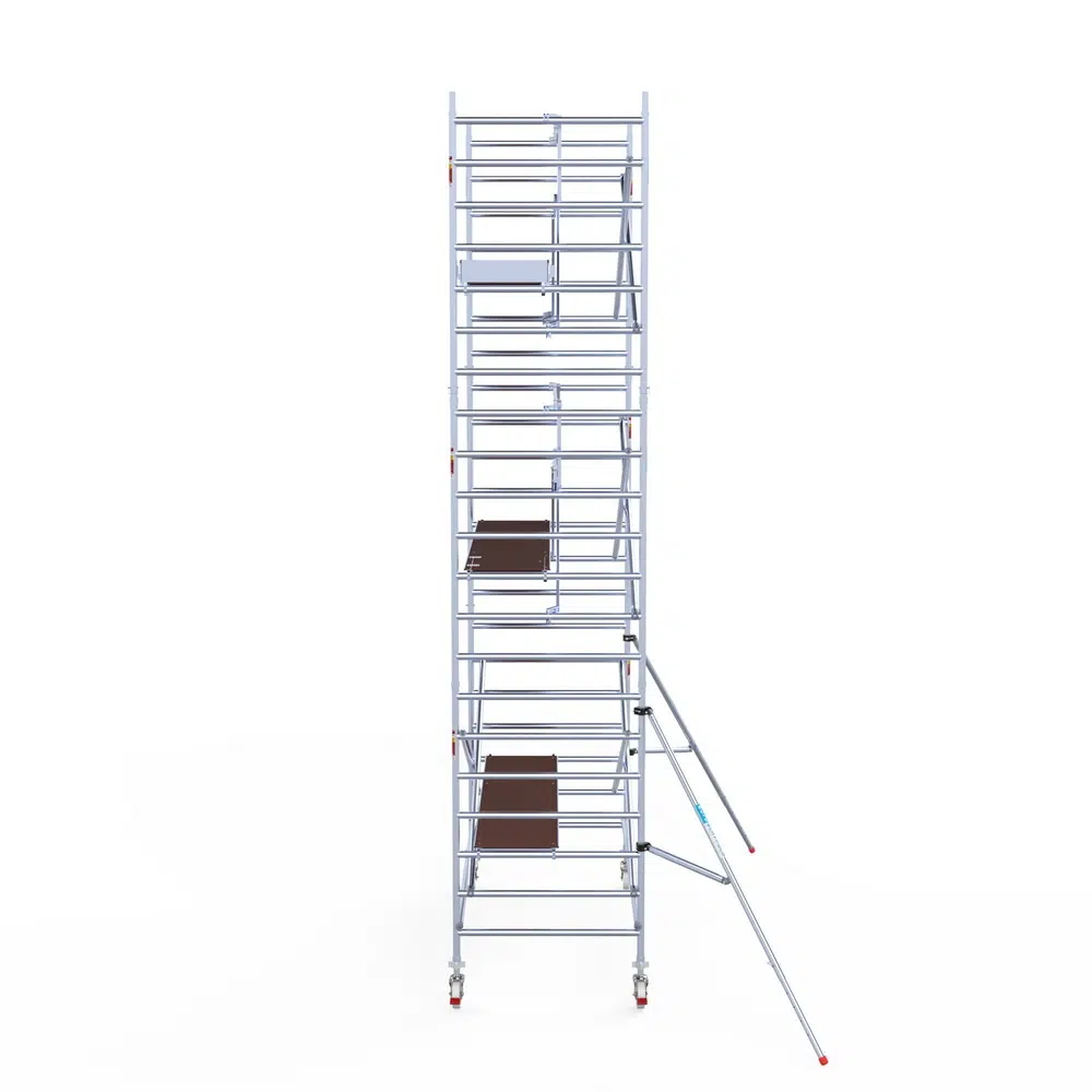 190 cm: Dit is de kleinste standaardmaat voor rolsteigers. Uitzonderingen zijn extra compacte kamersteigers of 1-persoonssteigers, die vaak platformlengtes van 120, 140 of 165 cm hebben. De 190 cm-variant wordt veel gebruikt bij kamersteigers en biedt voldoende ruimte om alleen comfortabel te werken.