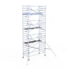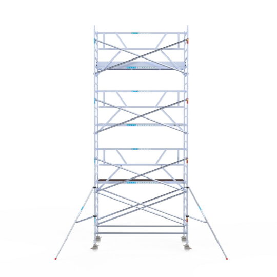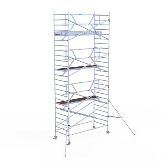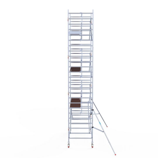 190 cm: Dit is de kleinste standaardmaat voor rolsteigers. Uitzonderingen zijn extra compacte kamersteigers of 1-persoonssteigers, die vaak platformlengtes van 120, 140 of 165 cm hebben. De 190 cm-variant wordt veel gebruikt bij kamersteigers en biedt voldoende ruimte om alleen comfortabel te werken.