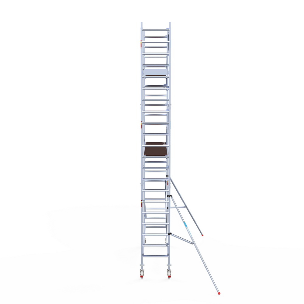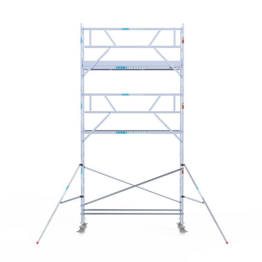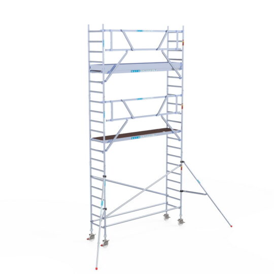 190 cm: Dit is de kleinste standaardmaat voor rolsteigers. Uitzonderingen zijn extra compacte kamersteigers of 1-persoonssteigers, die vaak platformlengtes van 120, 140 of 165 cm hebben. De 190 cm-variant wordt veel gebruikt bij kamersteigers en biedt voldoende ruimte om alleen comfortabel te werken.