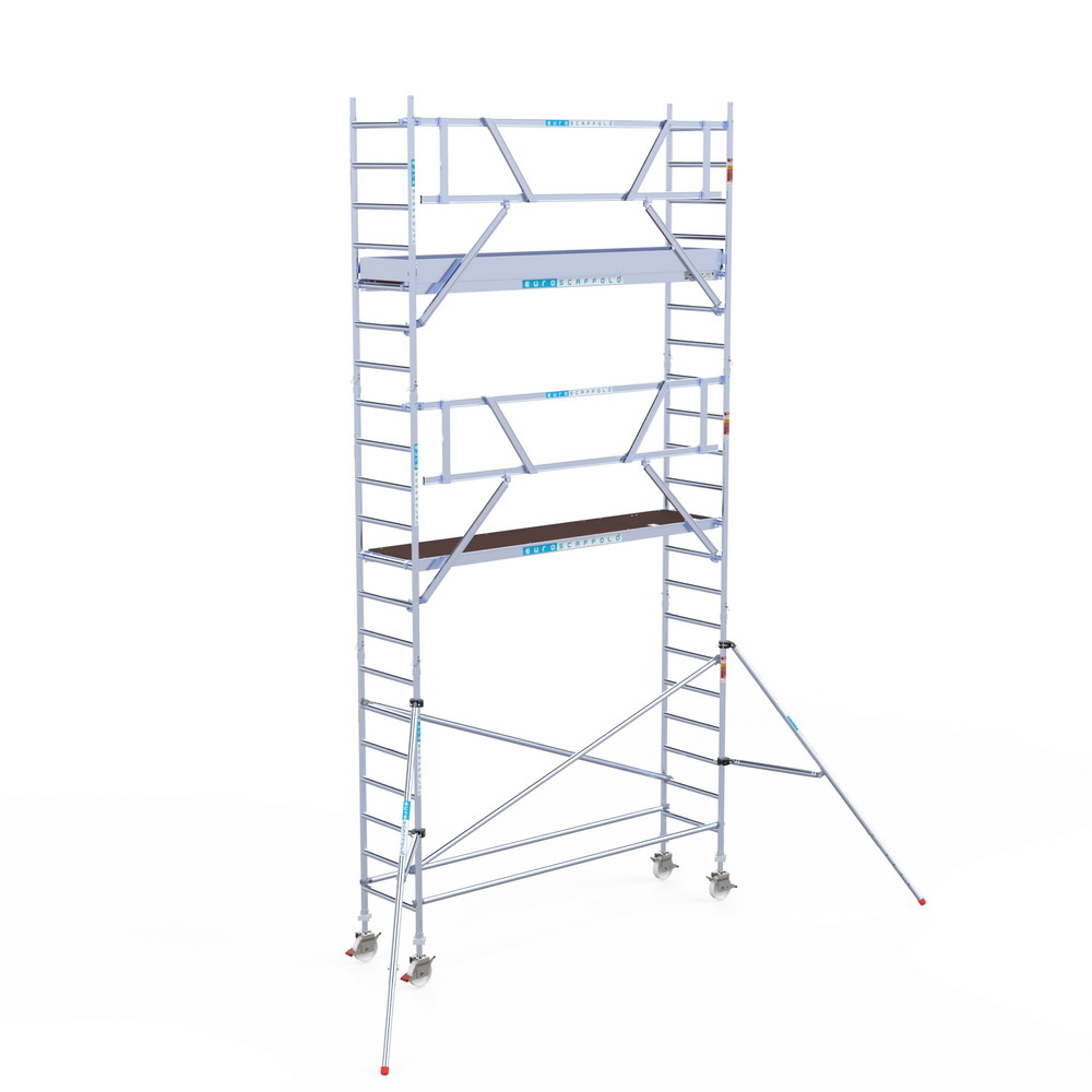 De Professional rolsteiger van Euroscaffold is een compleet uitgevoerde professionele rolsteiger volgens de professionele regelgeving EN1004. Zo werk je comfortabel én veilig. De opbouwsteiger is uitgevoerd met één voorloopleuning per etage voor gebruik bij een gevel, en 2 voorloopleuningen per etage voor vrijstaand gebruik. .