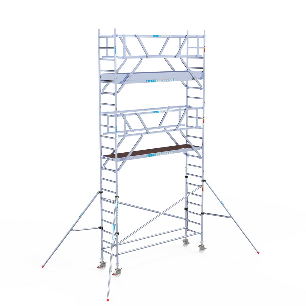 190 cm: Dit is de kleinste standaardmaat voor rolsteigers. Uitzonderingen zijn extra compacte kamersteigers of 1-persoonssteigers, die vaak platformlengtes van 120, 140 of 165 cm hebben. De 190 cm-variant wordt veel gebruikt bij kamersteigers en biedt voldoende ruimte om alleen comfortabel te werken.