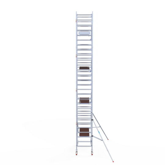 190 cm: Dit is de kleinste standaardmaat voor rolsteigers. Uitzonderingen zijn extra compacte kamersteigers of 1-persoonssteigers, die vaak platformlengtes van 120, 140 of 165 cm hebben. De 190 cm-variant wordt veel gebruikt bij kamersteigers en biedt voldoende ruimte om alleen comfortabel te werken.