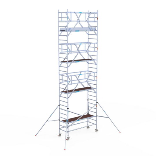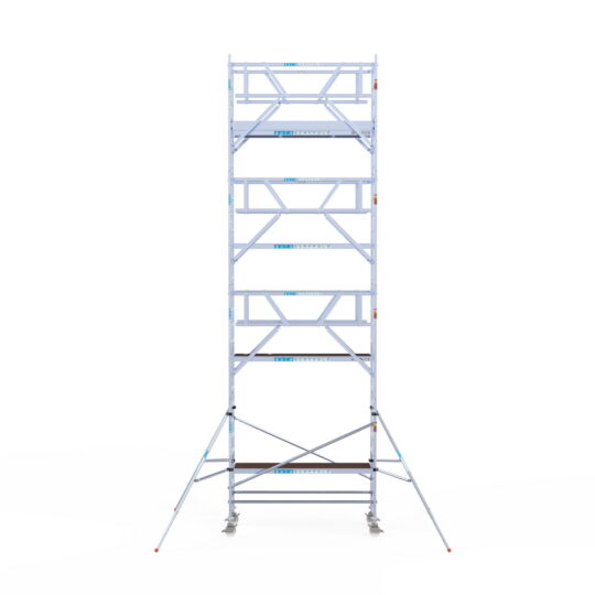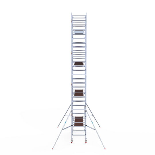 190 cm: Dit is de kleinste standaardmaat voor rolsteigers. Uitzonderingen zijn extra compacte kamersteigers of 1-persoonssteigers, die vaak platformlengtes van 120, 140 of 165 cm hebben. De 190 cm-variant wordt veel gebruikt bij kamersteigers en biedt voldoende ruimte om alleen comfortabel te werken.