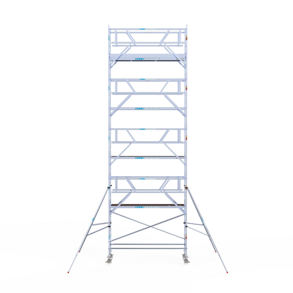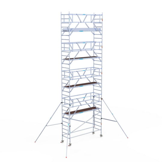 190 cm: Dit is de kleinste standaardmaat voor rolsteigers. Uitzonderingen zijn extra compacte kamersteigers of 1-persoonssteigers, die vaak platformlengtes van 120, 140 of 165 cm hebben. De 190 cm-variant wordt veel gebruikt bij kamersteigers en biedt voldoende ruimte om alleen comfortabel te werken.