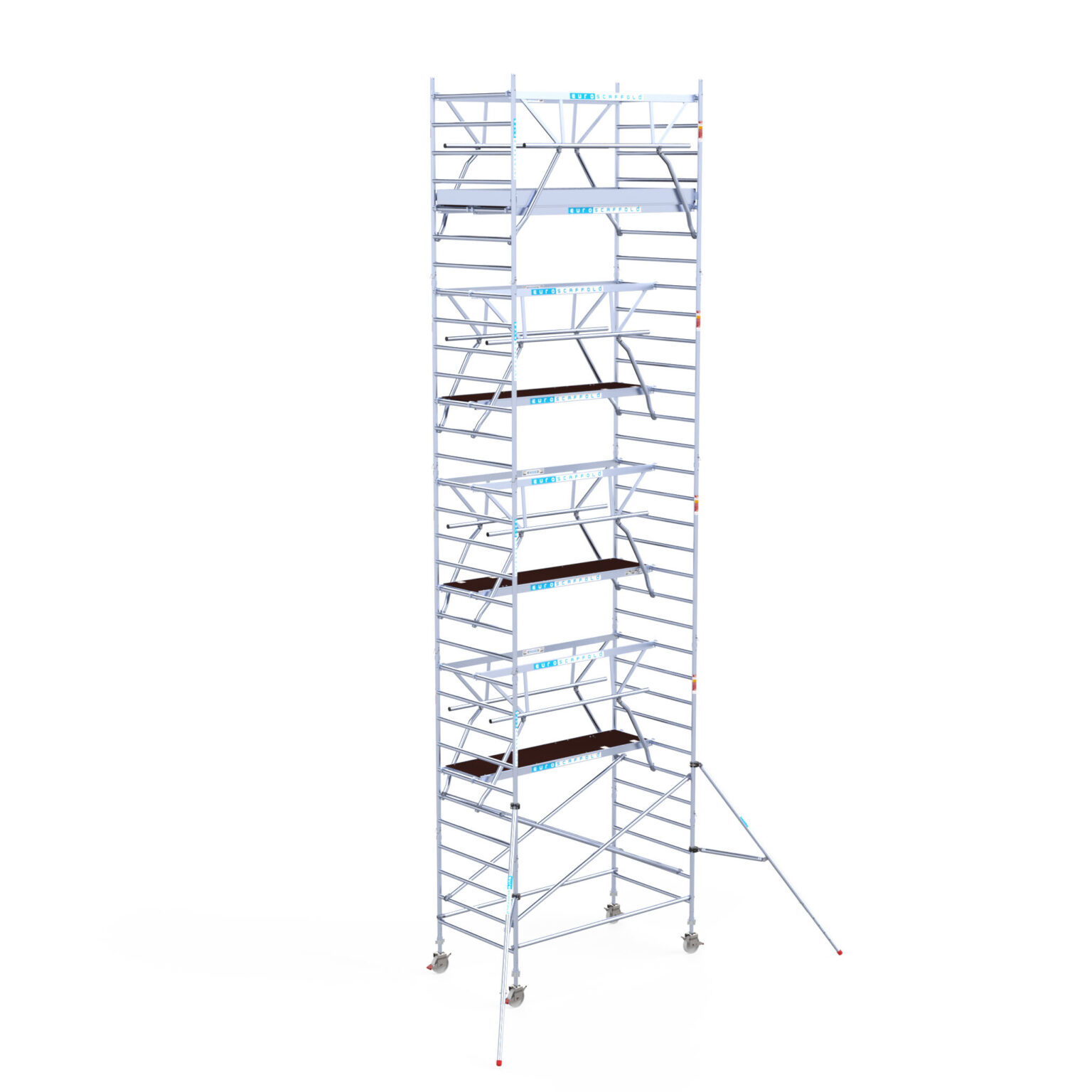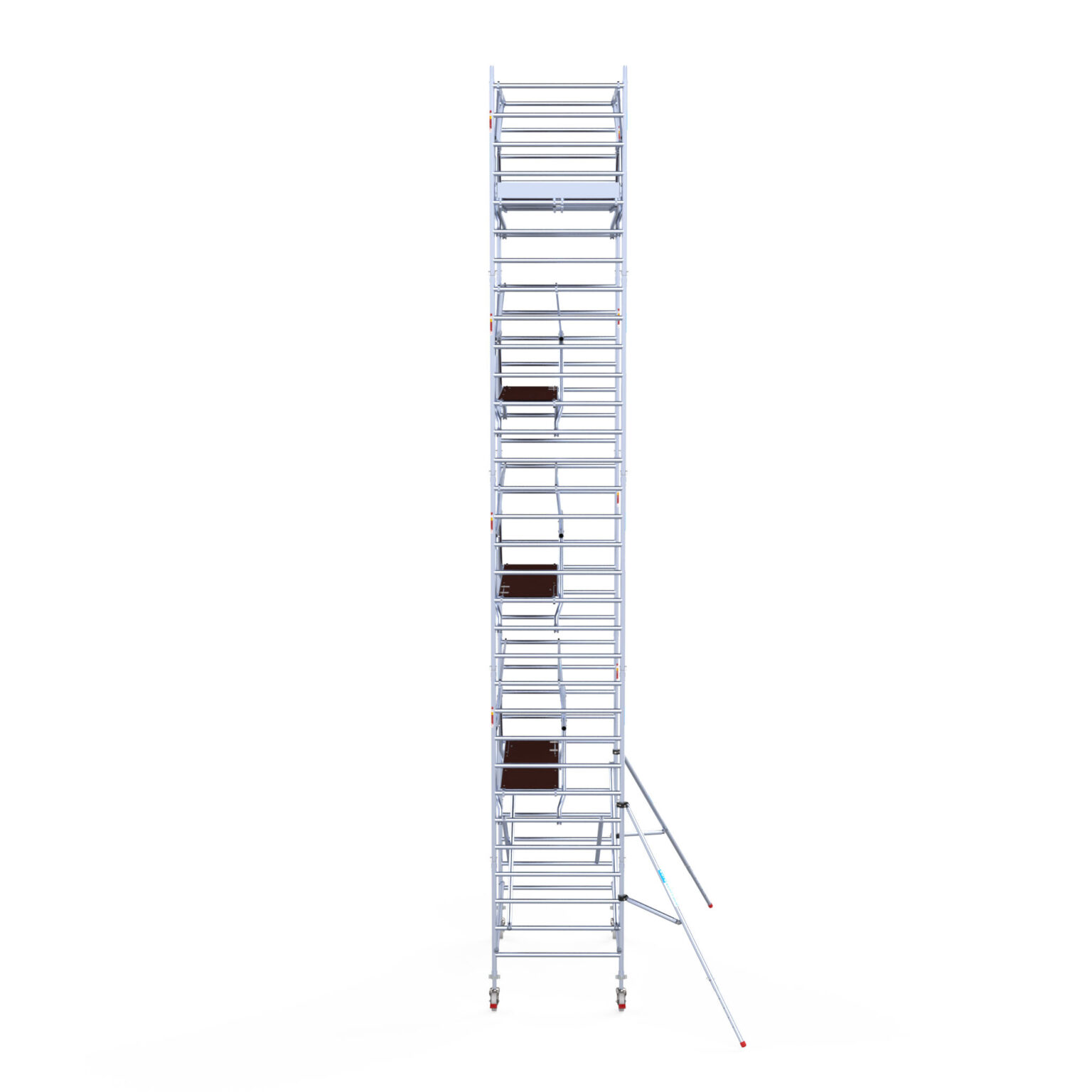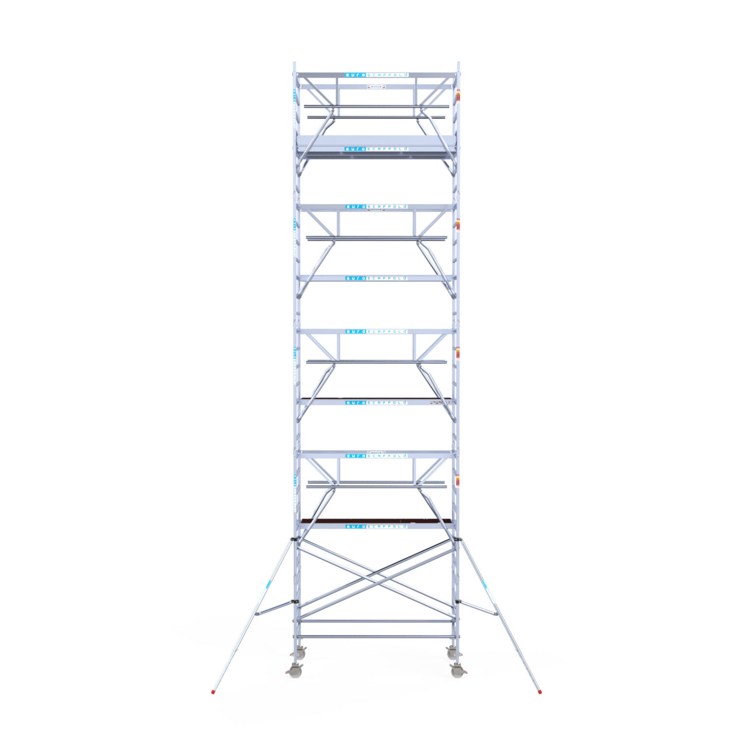 190 cm: Dit is de kleinste standaardmaat voor rolsteigers. Uitzonderingen zijn extra compacte kamersteigers of 1-persoonssteigers, die vaak platformlengtes van 120, 140 of 165 cm hebben. De 190 cm-variant wordt veel gebruikt bij kamersteigers en biedt voldoende ruimte om alleen comfortabel te werken.